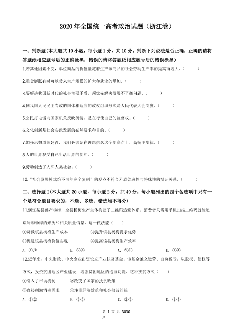 2020年政治高考真题--浙江7月选考