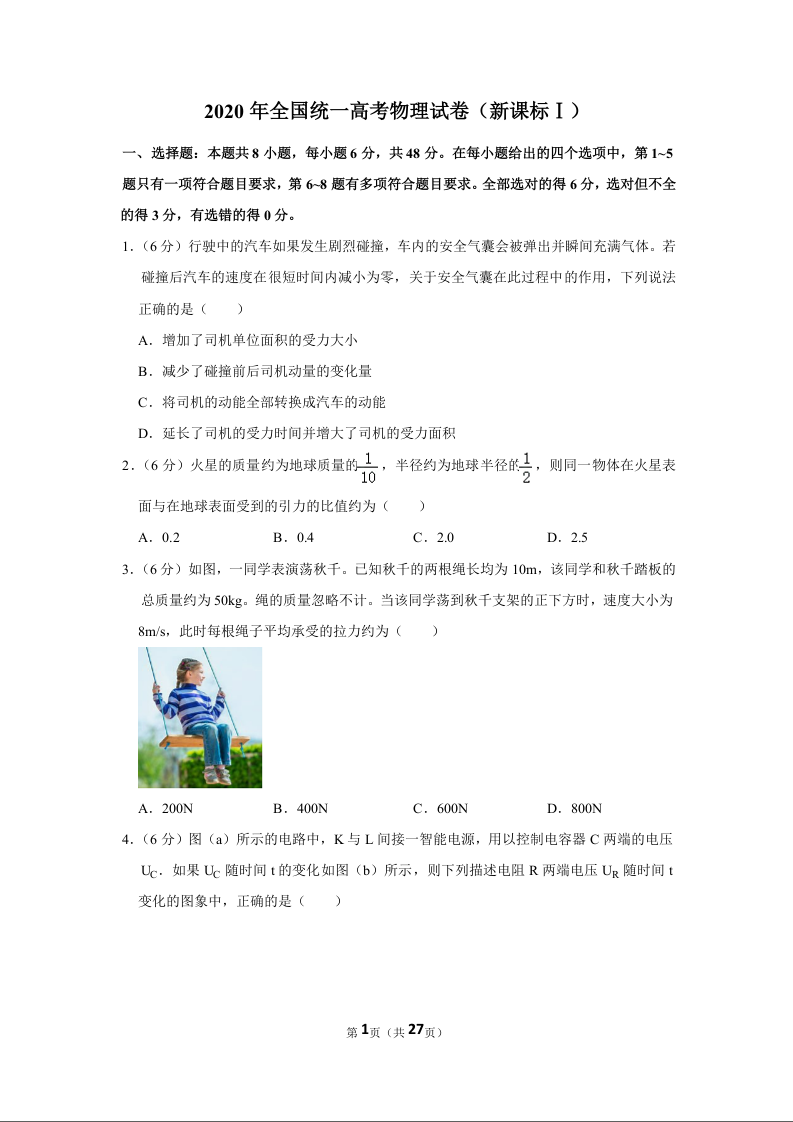 2020年全国统一高考物理试卷(新课标I)(含解析版)