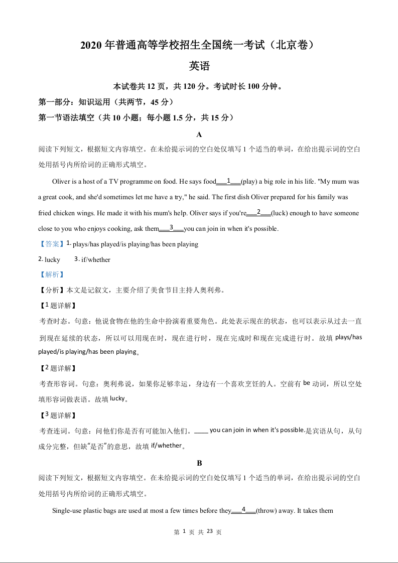 2020年北京市高考英语试卷(机考+无听力)答案