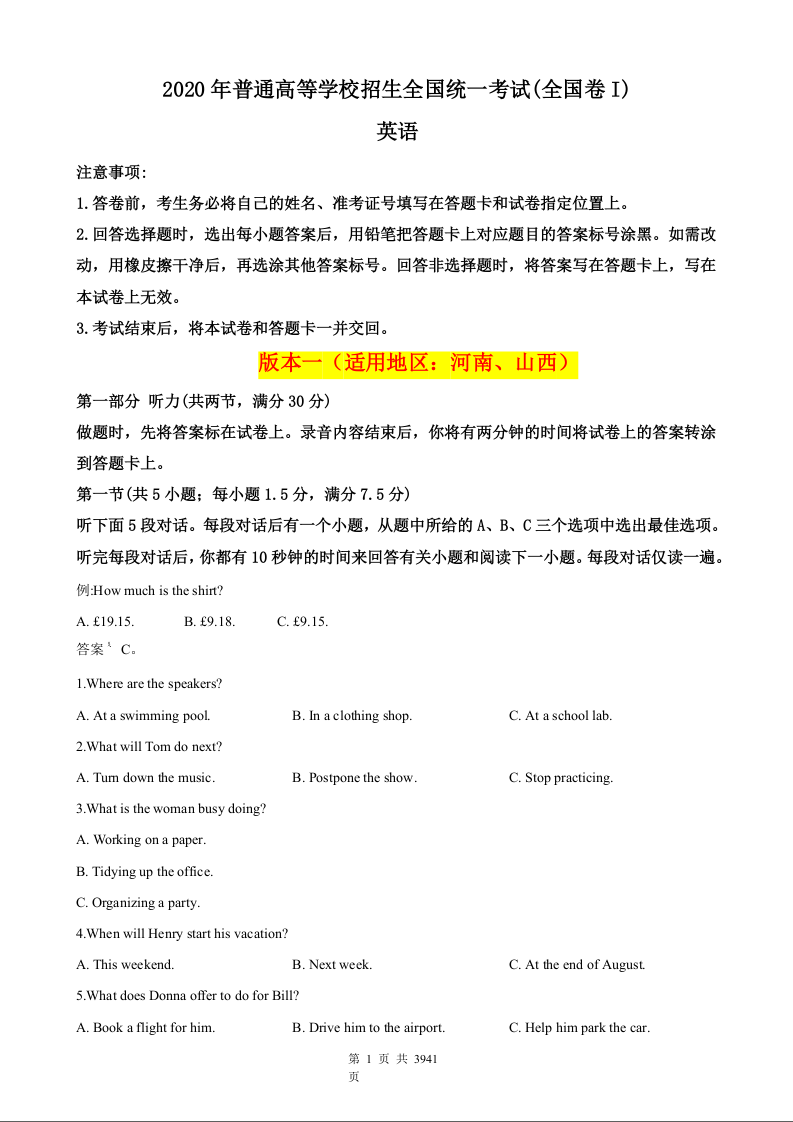 2020年高考英语试卷(新课标I)试题:适用河南、山西
