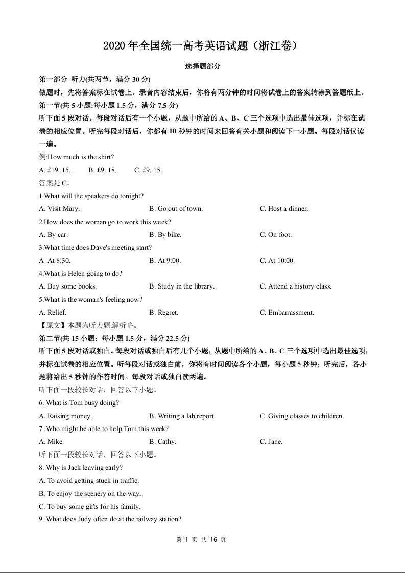 2020年全国高考英语试题及答案-浙江卷