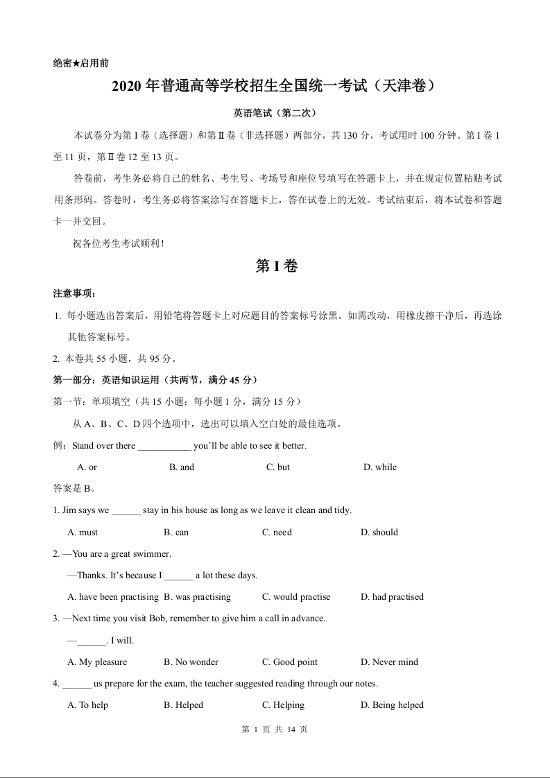 2020年天津高考英语试卷及答案