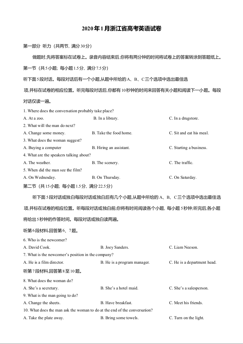 浙江省2020年1月新高考英语试题[含答案]