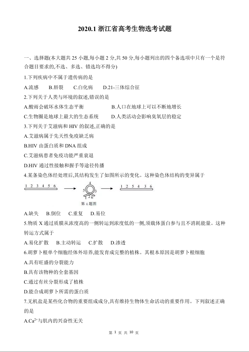 2020年1月浙江省生物选考试卷和答案