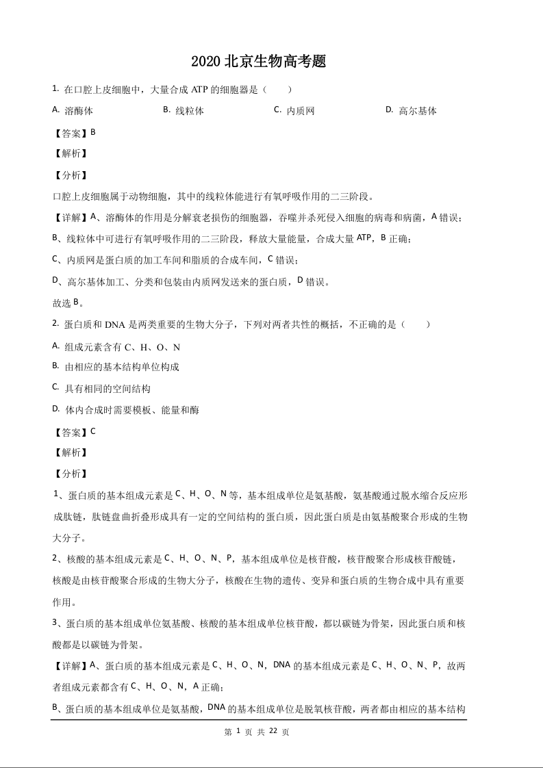 2020年高考生物真题(北京卷)答案