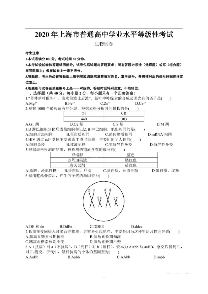2020年高考生物真题(上海卷)
