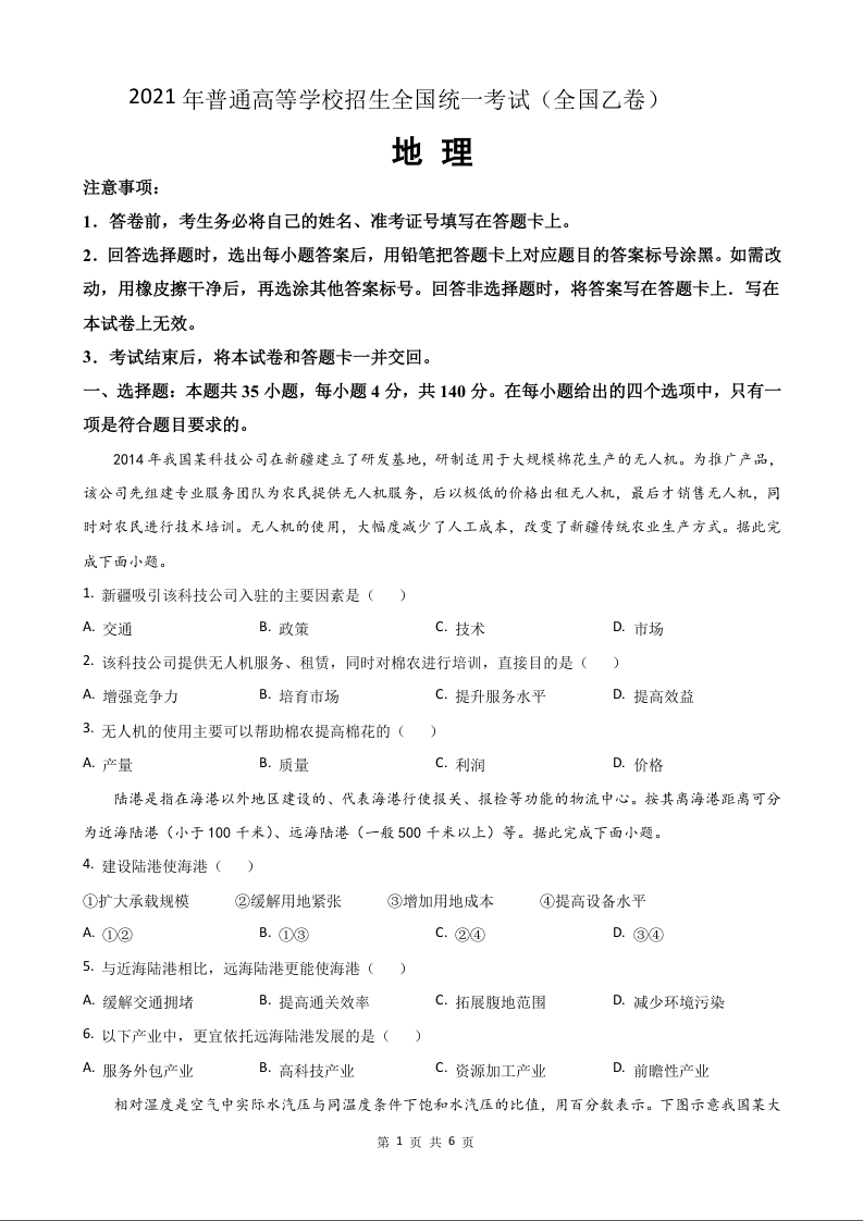 2021年地理高考真题--全国乙卷(原卷版)