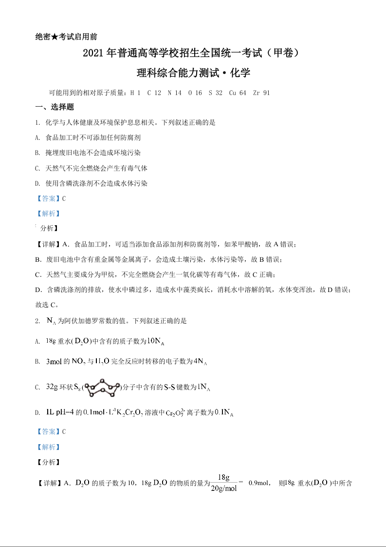 2021年高考全国甲卷化学试题(解析版)