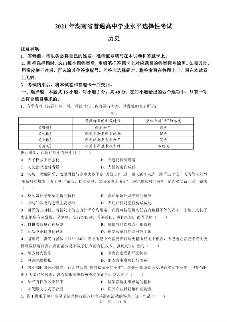 2021年历史高考真题--湖南卷+答案