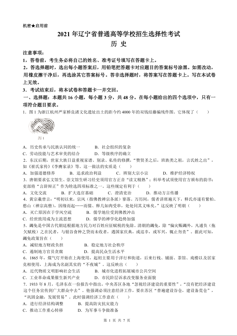 2021年历史高考真题--辽宁卷+答案