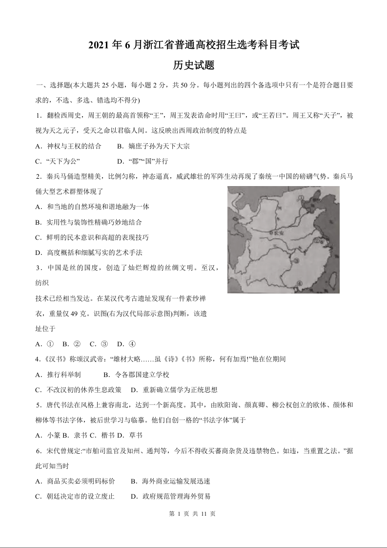 2021年历史高考真题--浙江卷+答案