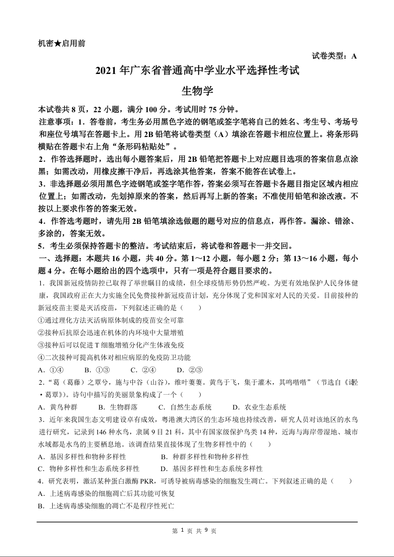 2021年高考生物真题(广东卷)试题