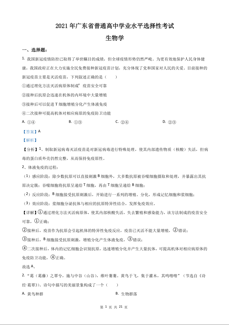 2021年高考生物真题(广东卷)+答案