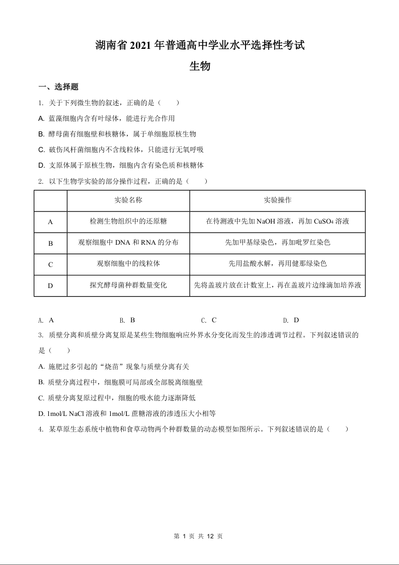 2021年高考生物真题(湖南卷)试题