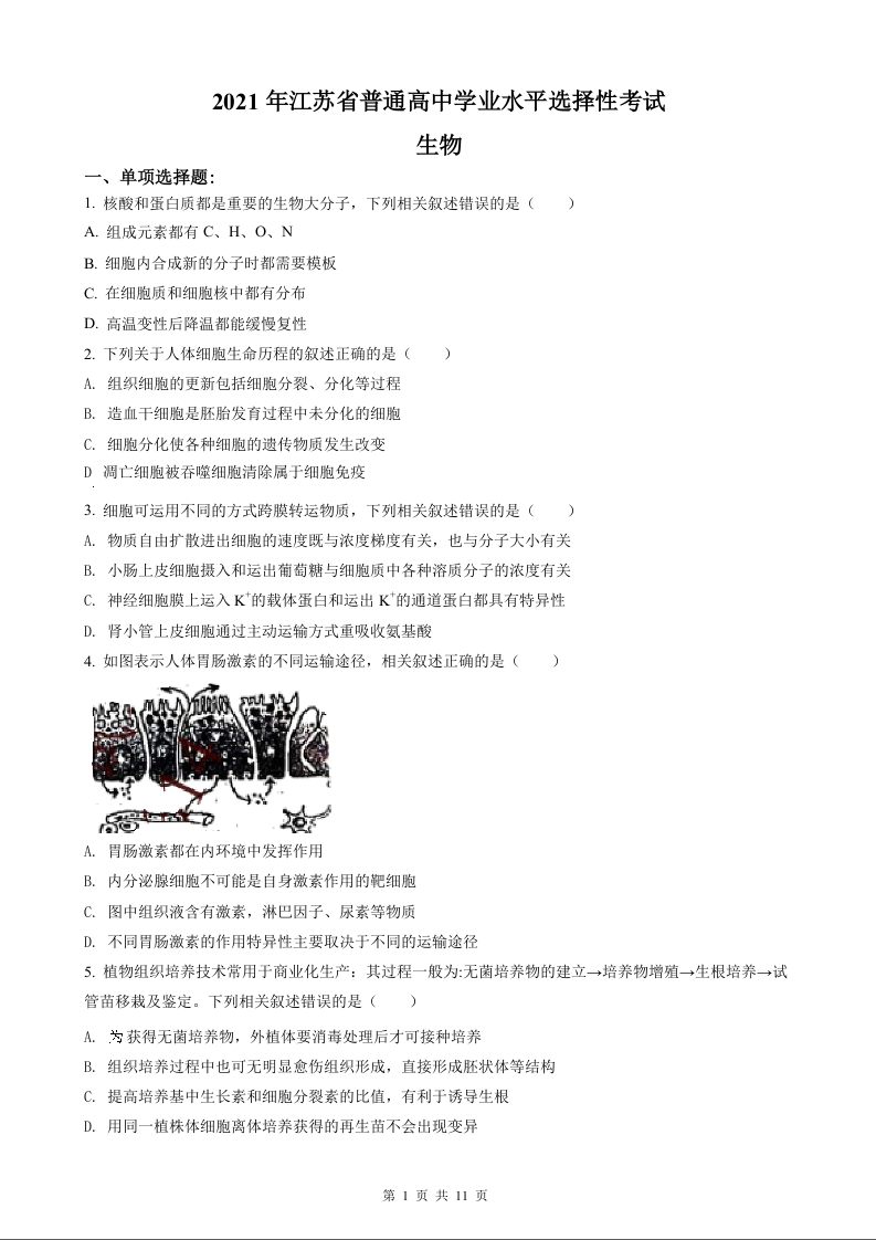 2021年高考生物真题(江苏卷)试题+答案