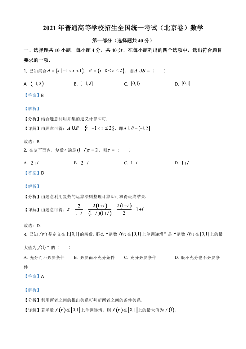2021年北京市高考数学试题答案