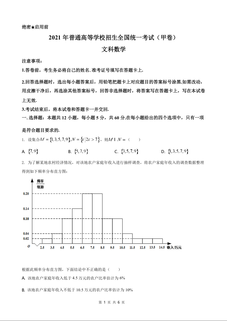 2021年全国高考甲卷数学(文)试题