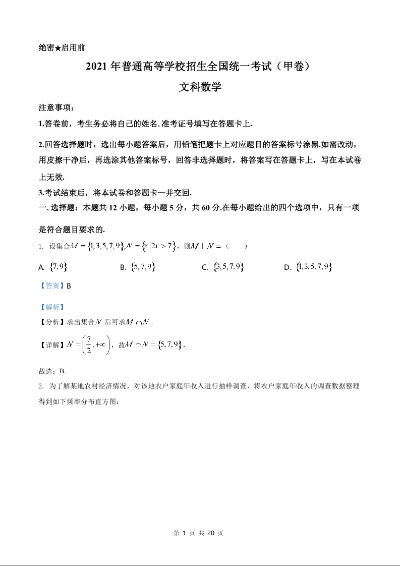 2021年全国高考甲卷数学(文)试题答案