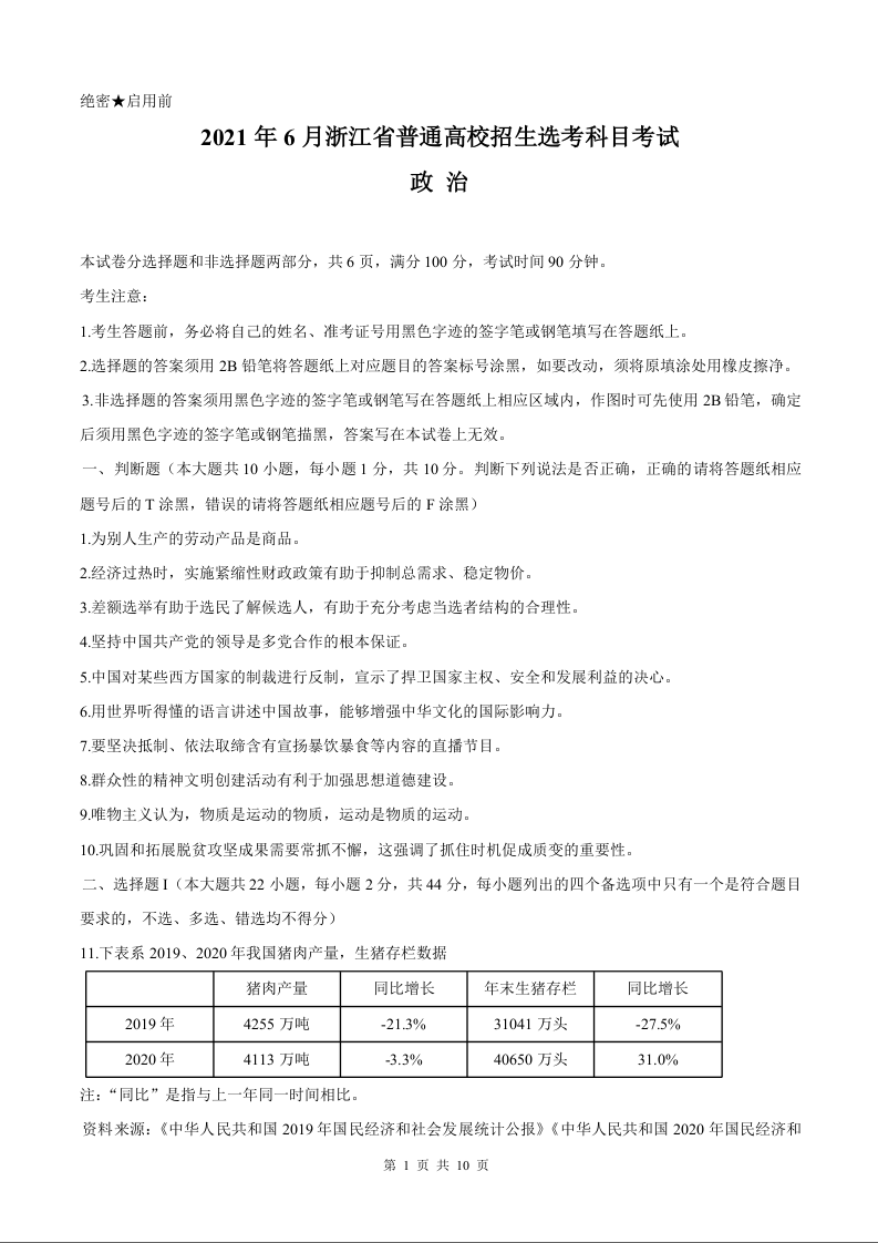 2021年思想政治高考真题--浙江卷+答案