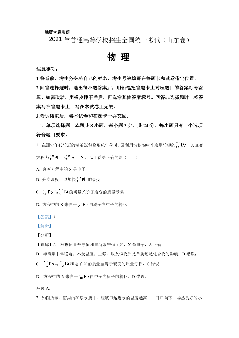 2021年高考真题物理(山东卷)(含解析版)