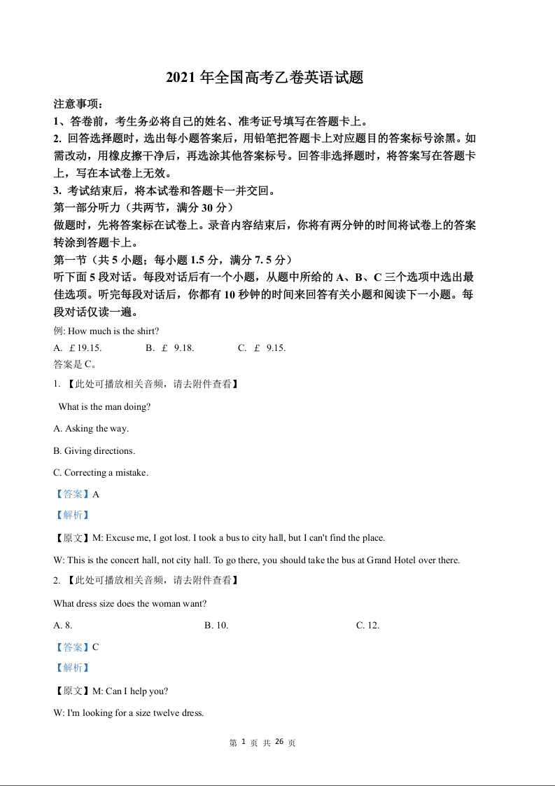 2021年高考英语试卷(全国乙卷)试题答案解析