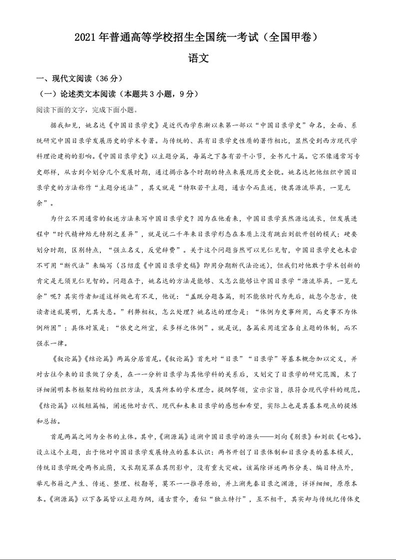 2021年普通高等学校招生全国统一考试语文试题(全国甲卷)(解析版)