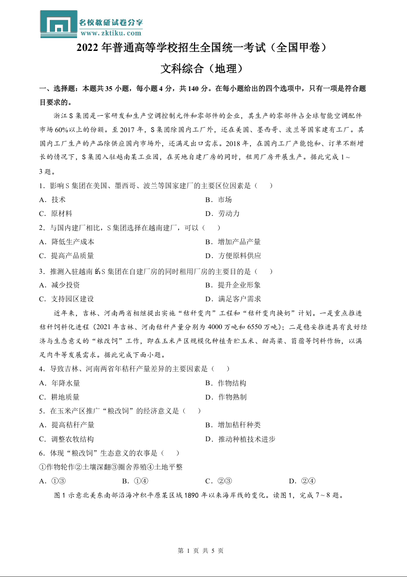 2022年地理高考真题--全国甲卷(试题)