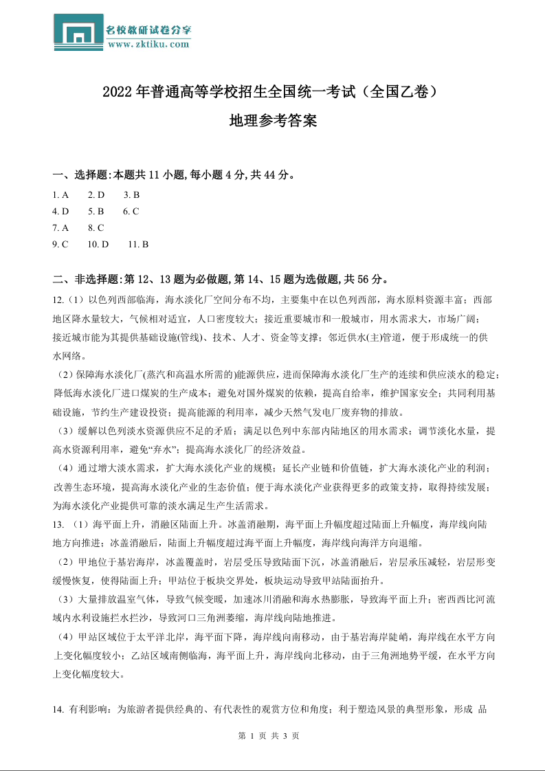2022年地理高考真题--全国乙卷(答案)