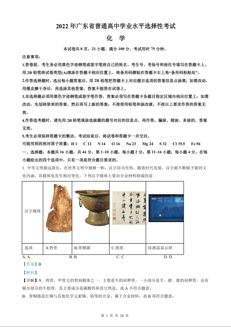 2022年广东省普通高中学业水平选择性考试化学试题+答案