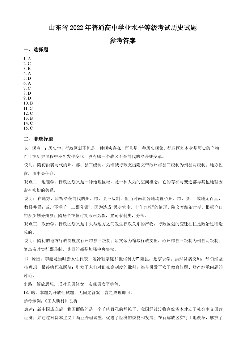2022年历史高考真题--湖南卷(答案)