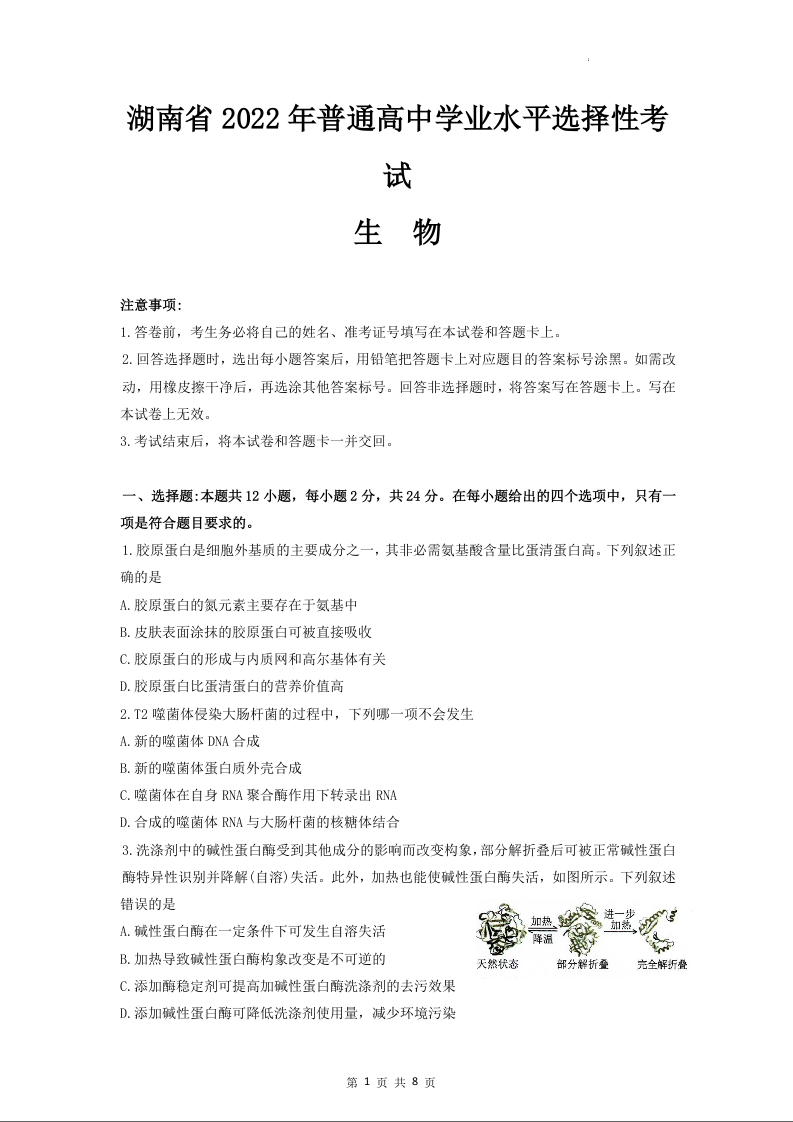 2022年高考生物真题(湖南卷)试题