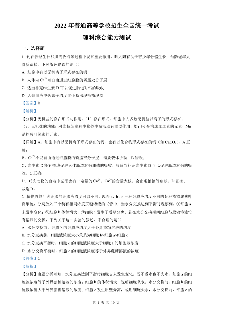 2022年高考生物真题(全国甲卷)试题