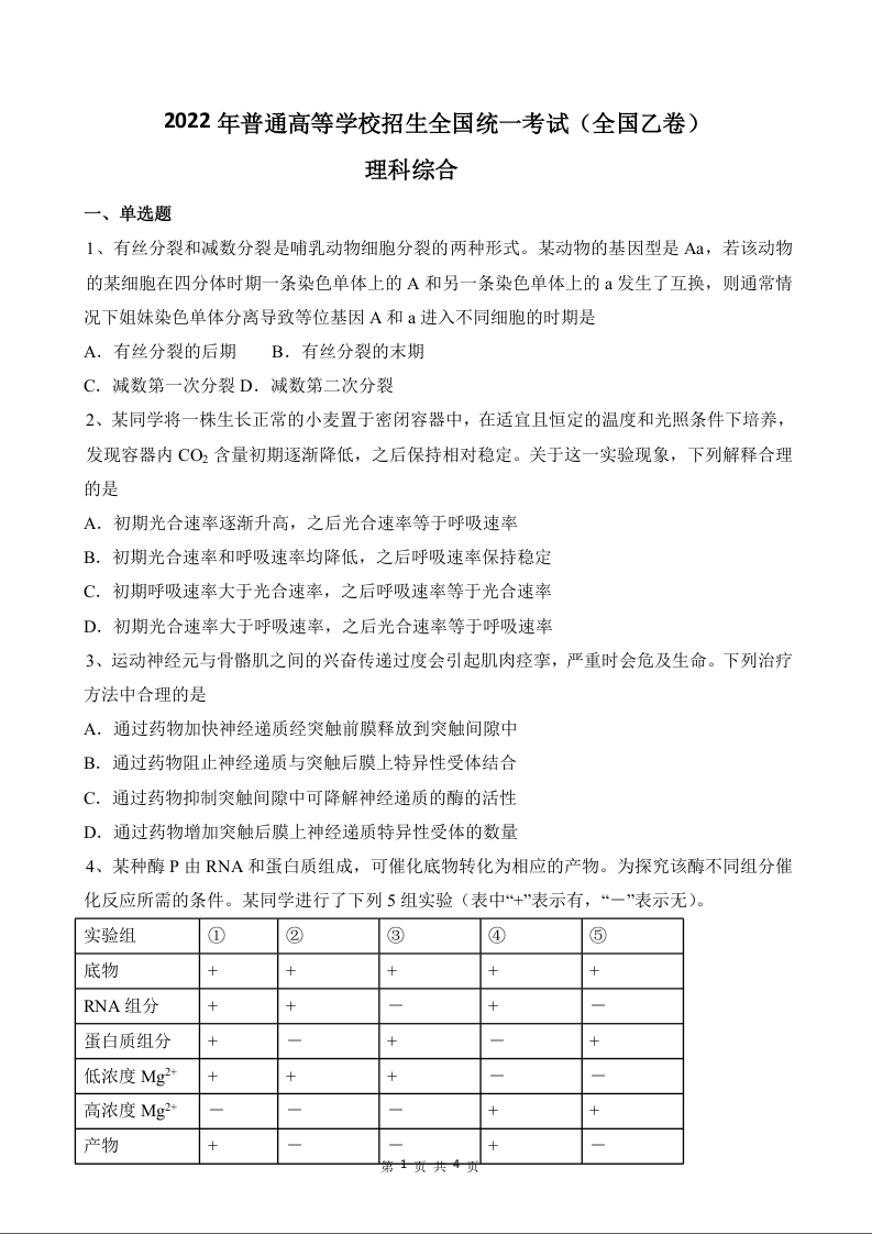2022年高考生物真题(全国乙卷)试卷
