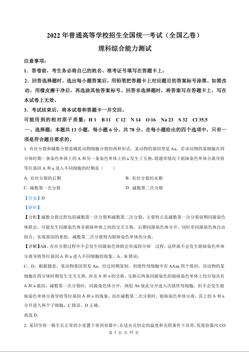 2022年高考生物真题(全国乙卷)答案