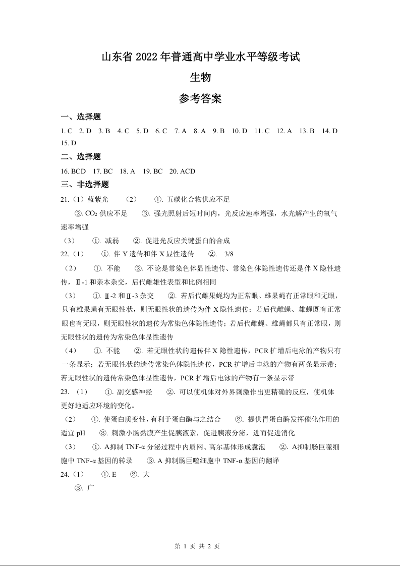 2022年高考生物真题(山东卷)答案