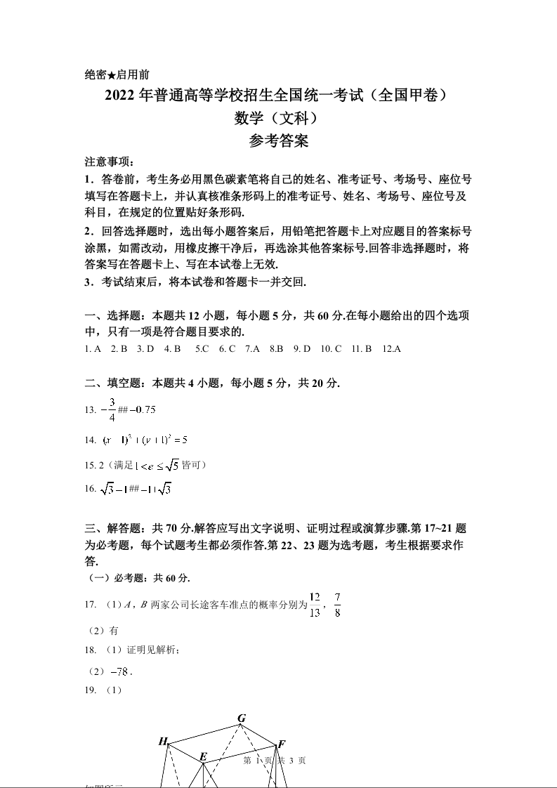 2022年全国甲卷数学(文科)试题答案
