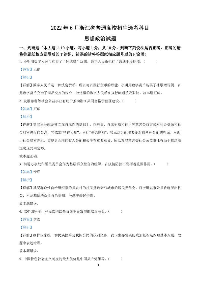 2022年思想政治高考真题--浙江卷(答案)