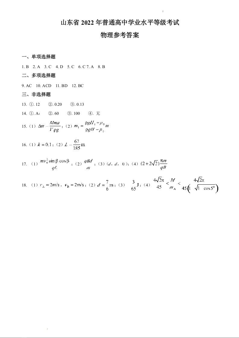 2022年新高考山东物理高考真题(答案)