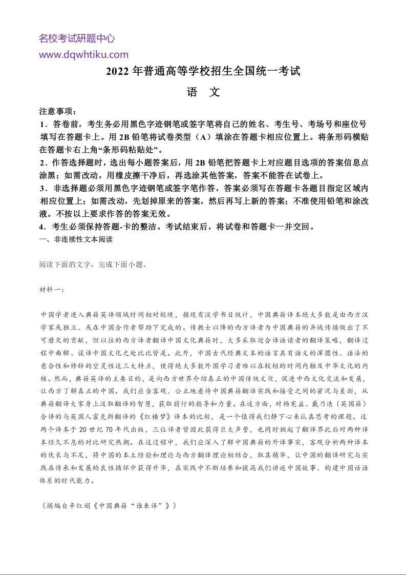 2022年普通高等学校招生全国统一考试语文-新高考2卷(含答案)