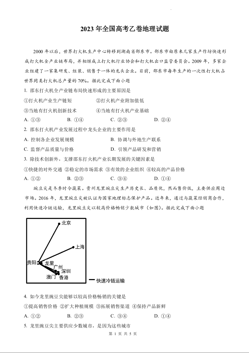 2023年地理高考真题--全国乙卷