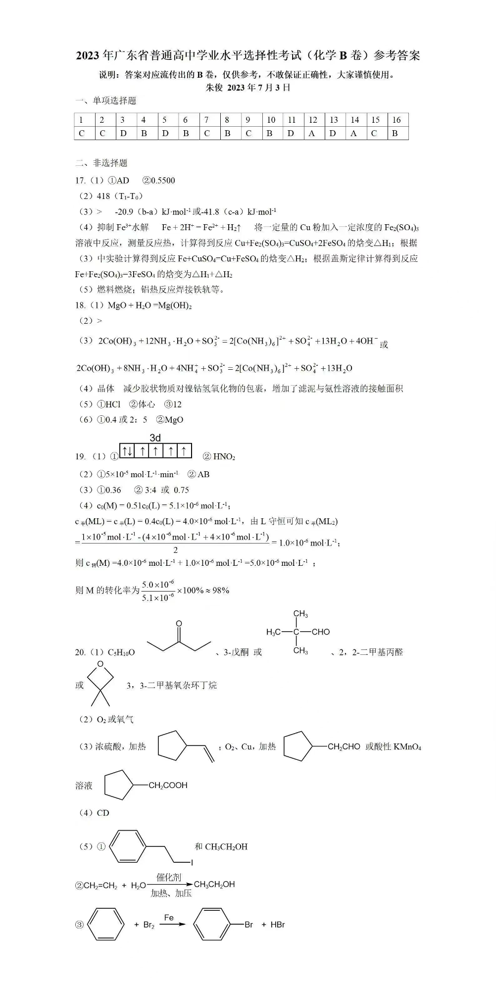 2023年化学高考真题参考答案--广东卷