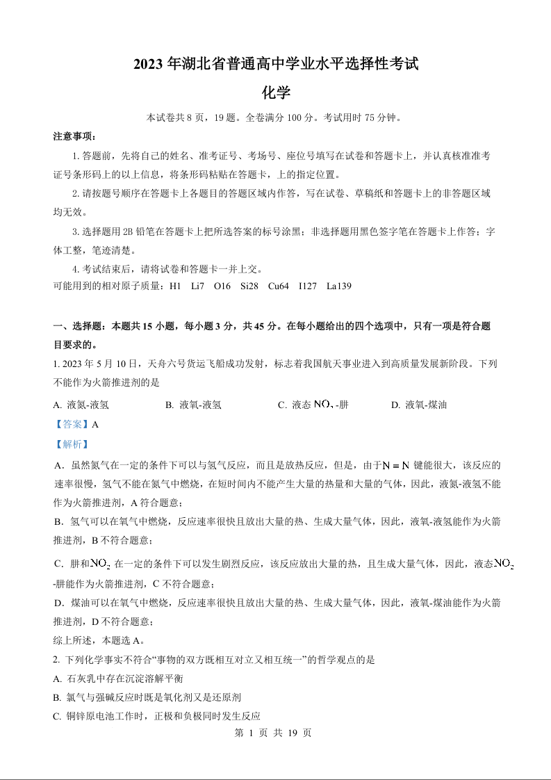 2023年化学高考真题和参考答案--湖北卷