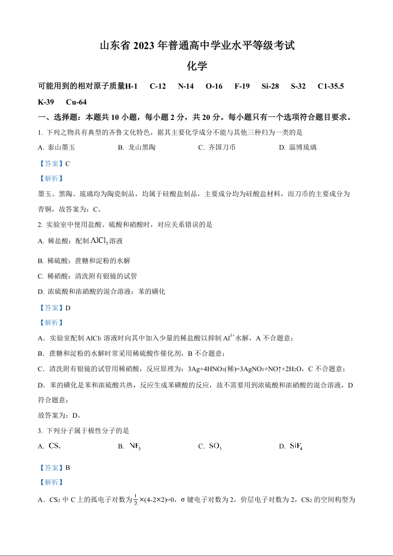 2023年化学高考真题及参考答案--山东卷