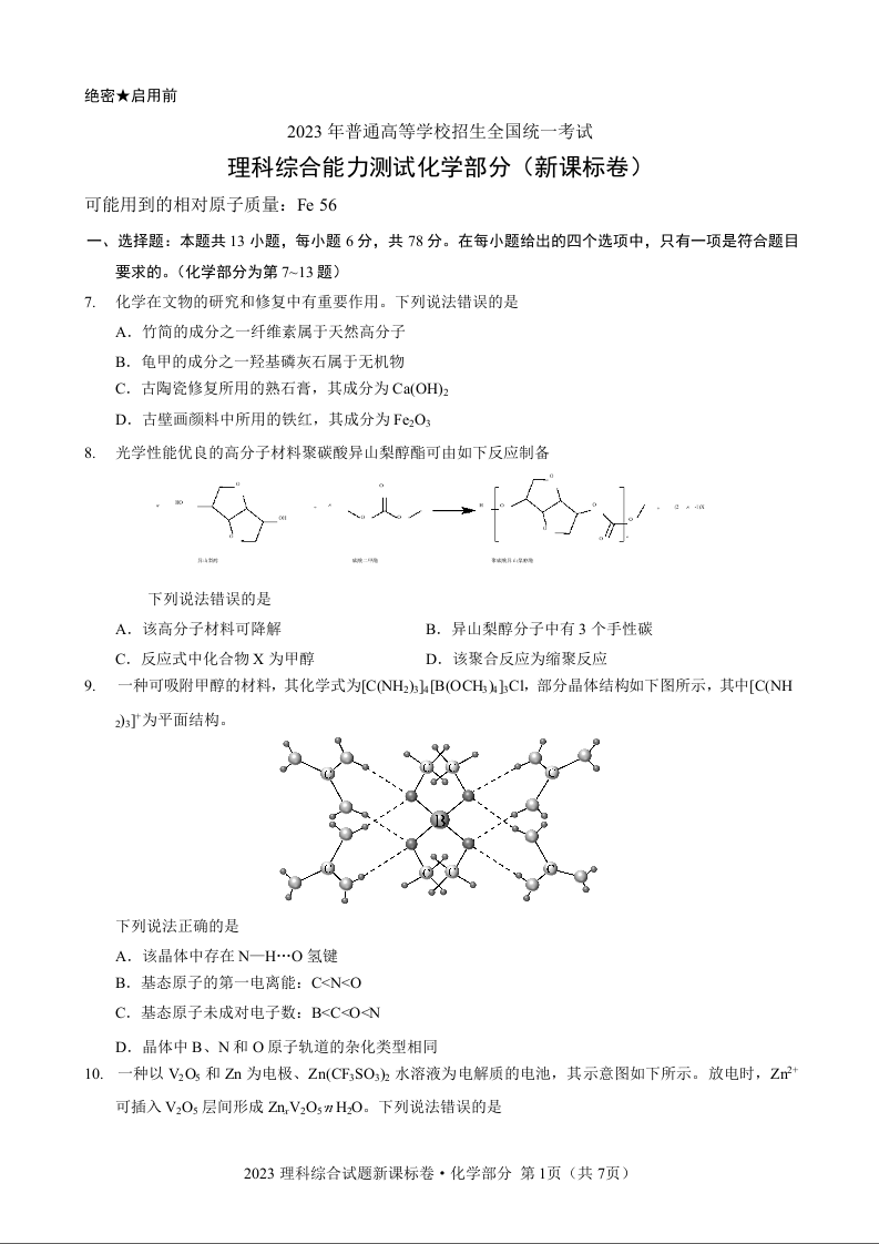 2023年全国理综化学试题和答案--新教材老高考(吉林卷)