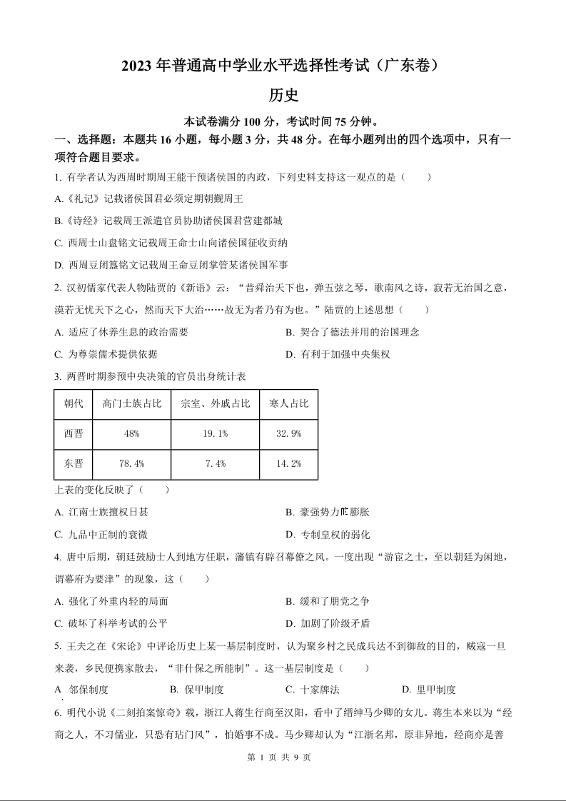 2023年历史高考真题--广东卷