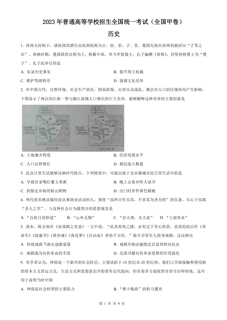 2023年历史高考真题--全国甲卷