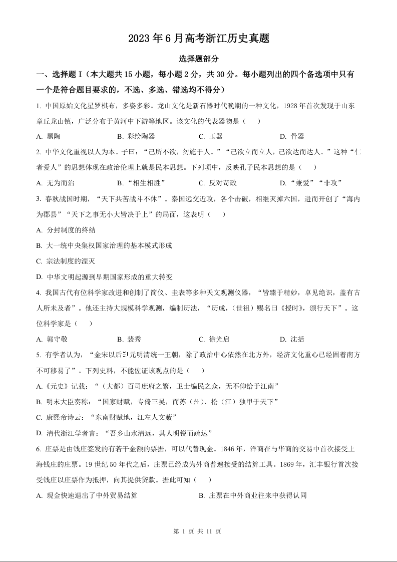 2023年历史高考真题--浙江卷