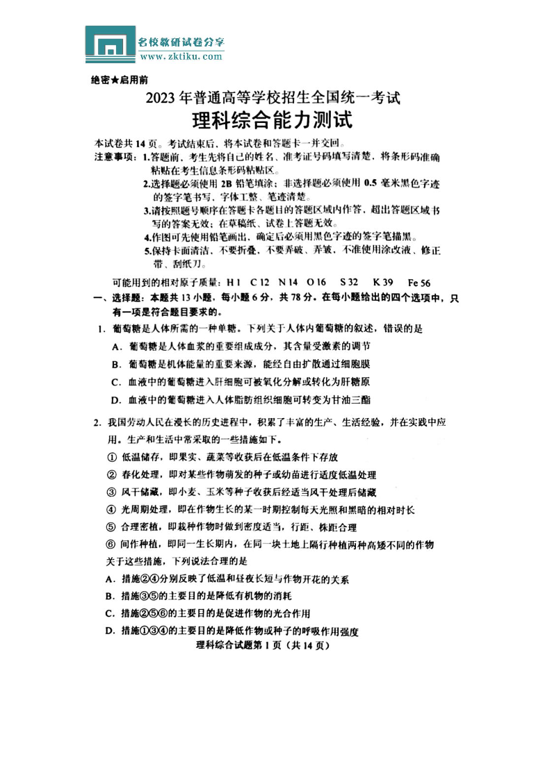 2023年生物高考真题--新教材老高考
