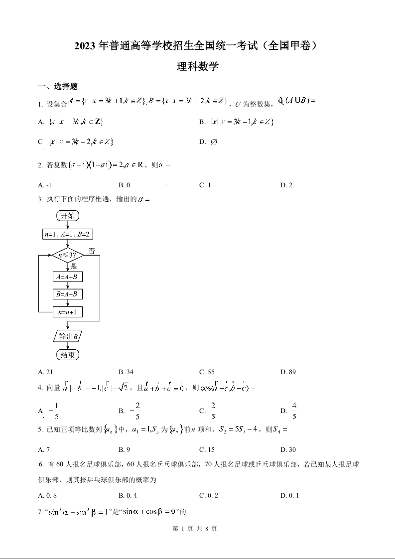 2023年数学高考真题--全国甲卷理科数学及答案