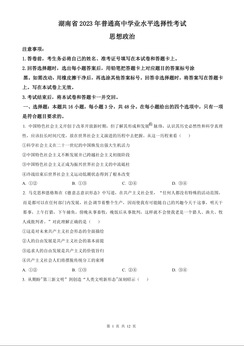 2023年思想政治高考真题--湖南卷